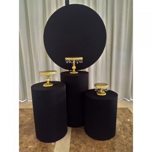 Mobiliario BLACK MIRROR ideal Graduaciones, Cumpleaños, Aniversarios y Eventos Corporativos. Mampara con 4 pies de diametro y altura de 8 pies; juego de mesas cilindricas con 50cm de diametro y alturas 90, 76 y 64 cm de diametro. Tambíen puede variar los colores de las fundas.