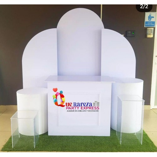 Este paquete esta conformado por Boho Principal ( 195cm de alto x 85cm de ancho) y 2 Boho Laterales (160cm de alto x 60cm de ancho). 1 cilindro (75cm de alto), 1 cilindro (60cm de alto). 1 mesa rectangular 2 mesas acrilicas cuadradas 30cm cuadrados con altura de 60cm y 70 cm. Alfombra verde. Adicionales: Funda para cilindro color mate en $5.00 cada uno, color brillante en $8.00 cada uno. Deposito retornable de $20.00 y Costo de entrega según el área. Rotulación o decoración completa contactarnos para cotizar. Atención: Separar con 10 días de anticipación y se solicita abono del 50%. Si anula la reserva tiene recargo del 20%. Encuentre la mayor variedad de decoración de eventos y alquiler de mobiliarios como sillas y mesas en panamá. alquiler de mobiliario, sillas, mesas y muebles lounge para eventos. Decoraciones de todo tipo de eventos.